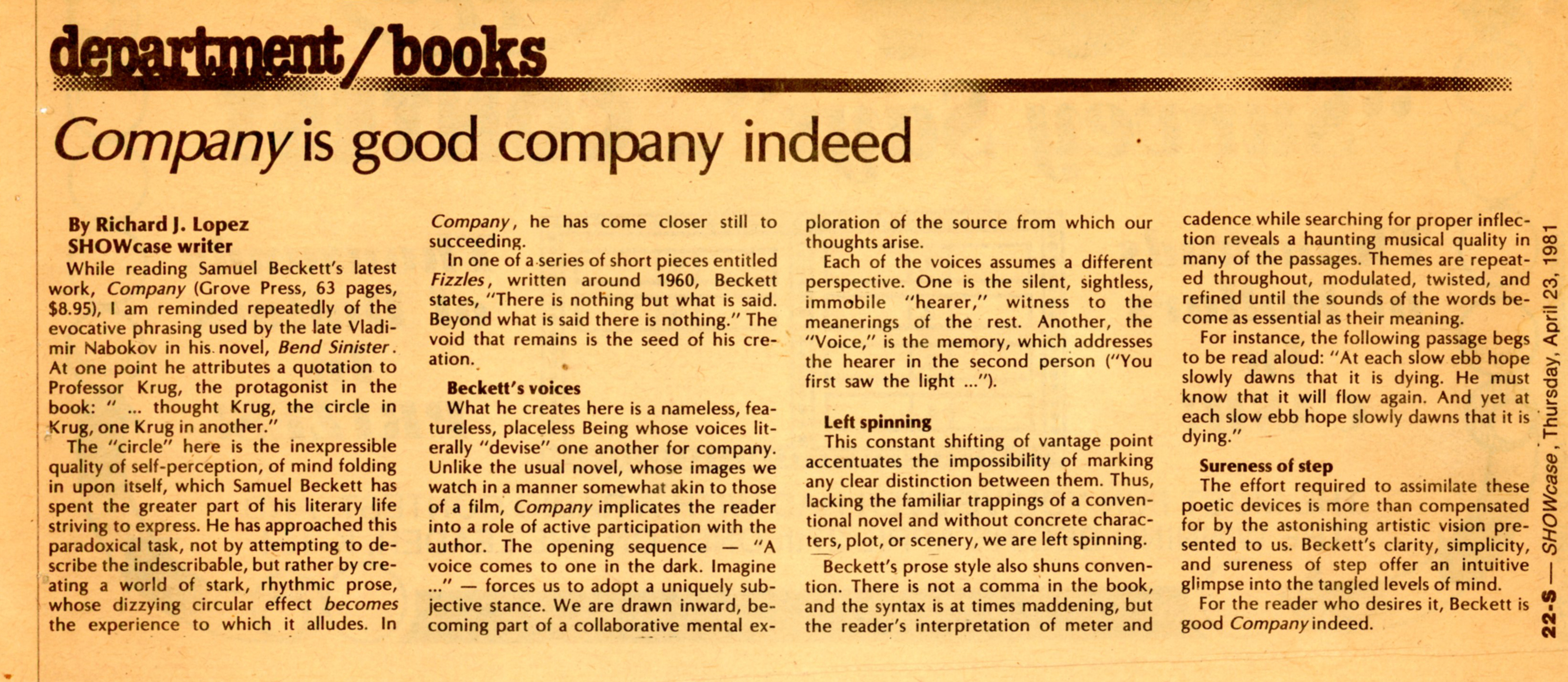 Samuel Beckett: “I filled ten feet of shelf space ... with criticism, unpublished ephemera, video and audio tapes, ... attended symposiums, ... world premieres, produced and directed three programs of the one-act plays, joined the Samuel Beckett Society, subscribed to the Journal of Beckett Studies, and gradually drowned. It was a good death.”