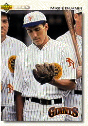 ...Mike Benjamin got lost in thought on Upper Deck card #268, decked out in the cool starched orange-striped whites of the 1925 New York Giants before a "turn-back-the-clock" game, and, I like to think, was gazing with love and awe at the 60-year-old leather mitt on his hand—but I bet he was just confused.